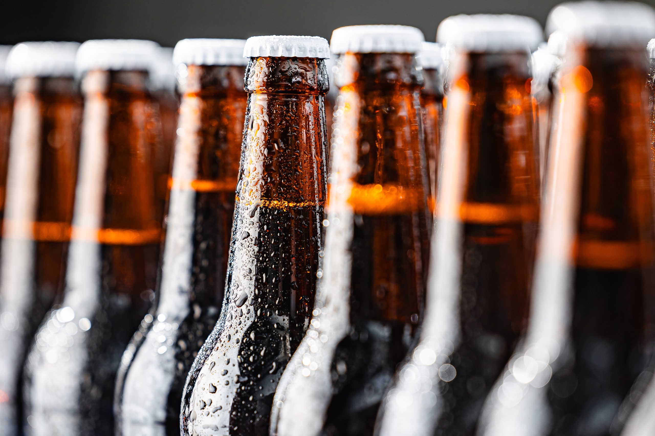 Row,Cold,Ice,Beer,Bottles,With,Drops,Of,Water,Against